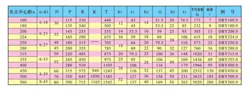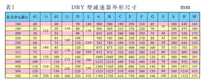 DBY、DBYK、DBZ型減速機各有12種規(guī)格,名義中心距為:160,180,200,224,250,280,315,355,400,450,500,560mm每種規(guī)格均有5種傳動比(8,10,11.2,12.5,14)兩種旋向,四種裝配型式,分別組成240種減速機。